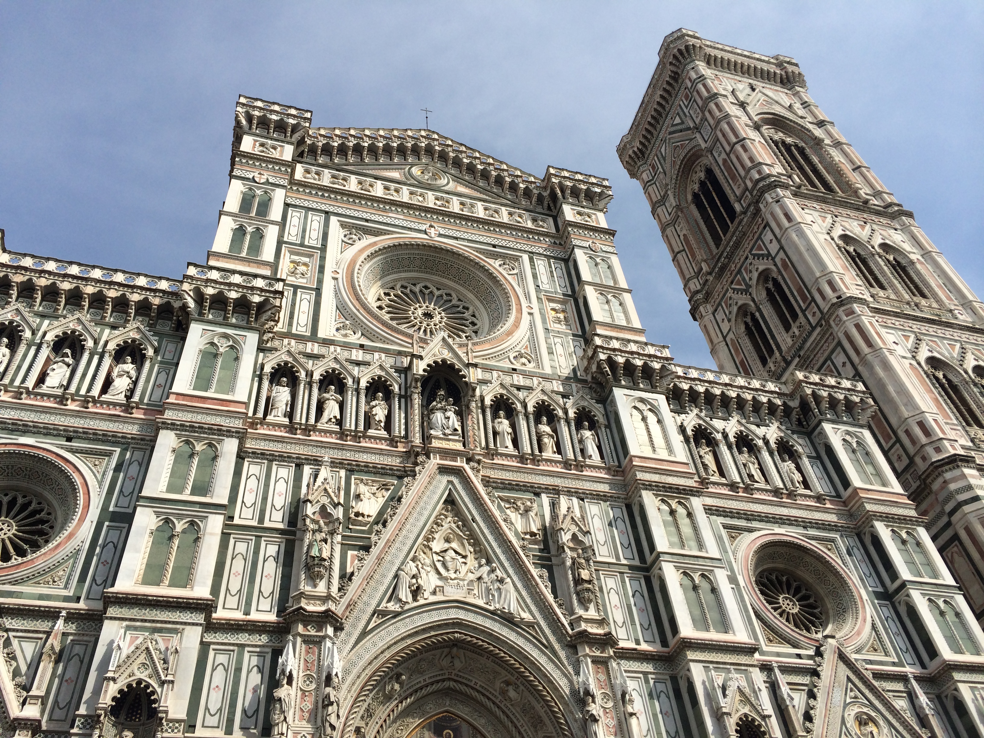 The Duomo in Florence sneak attacks you like a spring storm. You’re walking down the cobblestone, turn a corner, and bam—you get blindsided by white and green and red, a cathedral so expansive it takes four separate shots to capture it on film. Inside, the arches dazzle like umbrellas, the domed ceiling pulling you heavenward: Christ in glory, in precious metal glow, surrounded by everyone under the sun.