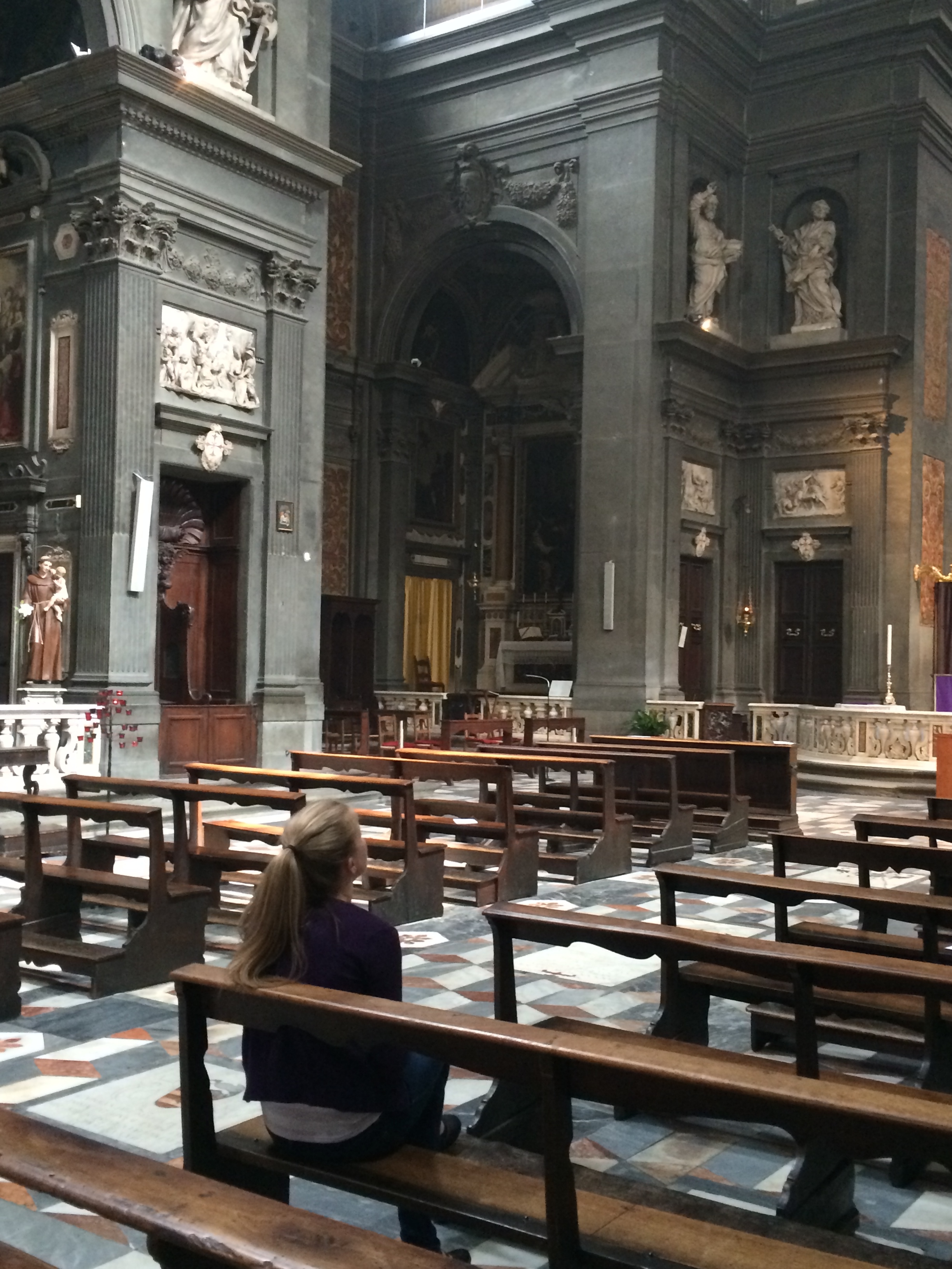A baby starts having a fit in Santa Maria Novella, the screams echoing from front to back, top to bottom, shrill cries ricocheting from stone to space to stone. They let us inside the cloister of the convent—I don’t know why—but we have to check the backpack, and we can’t take pictures, and a guard stands watch at each corner, eyeing our steps. We make a game of pointing out the grumps in every fresco.